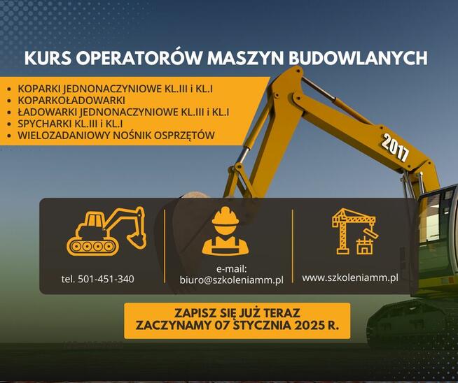 ZAPISY NA KURS OPERATORÓW MASZYN BUDOWLANYCH! - koparki jednonaczyniowe do 25 ton kl.III - koparki jednonaczyniowe kl.I - ...